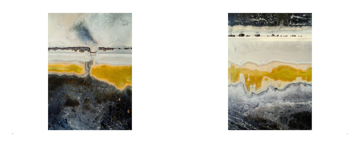 Der eingelegte Archivpigmentdruck zeigt eine der vielen Salinenanlagen, die der Fotograf aus der Luft portraitierte und in ihrer einzigartigen Schönheit als abstraktes Feld festgehalten hat. N°TSSIII02, San Francisco Bay, California, United States ist eines jener visuellen Spektakel aus wunderschönen Geometrien und beeindruckenden Farben und gleichzeitig das Covermotiv dieser beeindruckend schönen Sammlung.