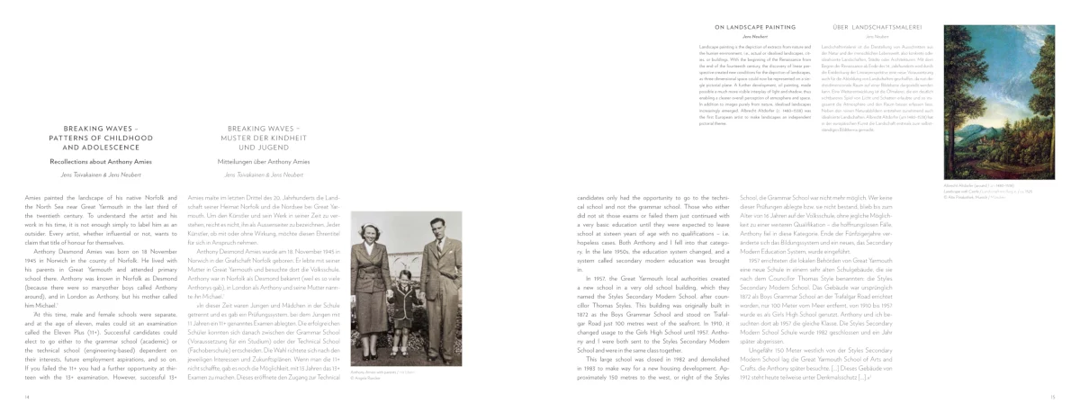 Anthony Amies’ Bilder behaupten eine klassische Auffassung von Malerei. Ab Mitte der 1970er-Jahre verfolgte der britische Künstler mit einer stilistisch eigenen Landschaftsmalerei ein radikales Gegenkonzept zur Kunst seiner Zeit. Es sind ruhige und rätselhafte Bilder, die auf jeglichen Skandal verzichten. In der Tradition des britischen Landschaftsmalers Alexander Cozens schuf Amies großflächige Zeichnungen und Ölbilder, die nur scheinbar realistisch sind. Vielmehr abstrahiert er die Landschaft zu einer Idee. Die Reduktion auf Land und See ist ein Nachdenken über England und den Verlust seiner ursprünglichen Landschaften an die Industrialisierung. Im Kontext seiner Zeit besteht in der Behauptung des Genres Landschaftsmalerei und in dessen malerischer Formulierung die Bedeutung dieses englischen Malers.
